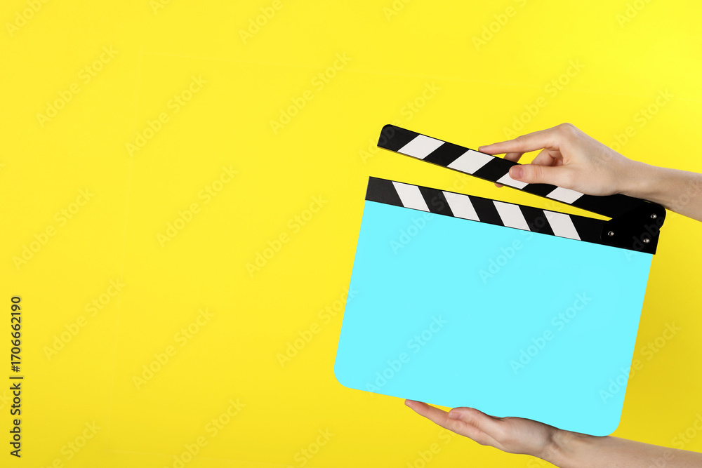 Woman holding cyan clapperboard on yellow background, closeup with space for text. Film industry
