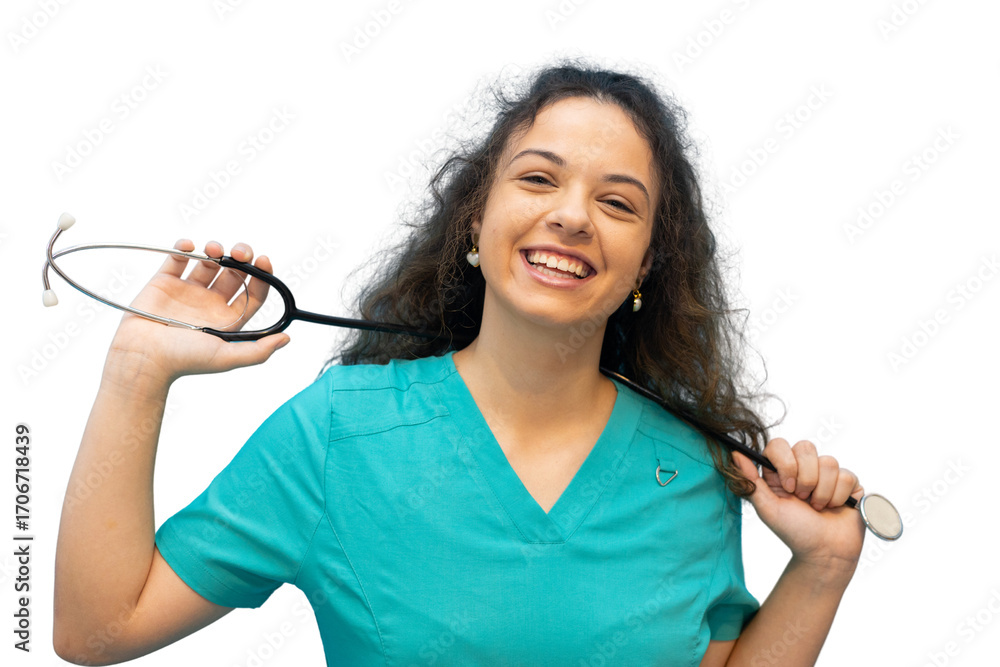 Portrait of cheerful female doctor wearing teal uniform holding stethoscope on her shoulders, smiling on transparent background