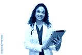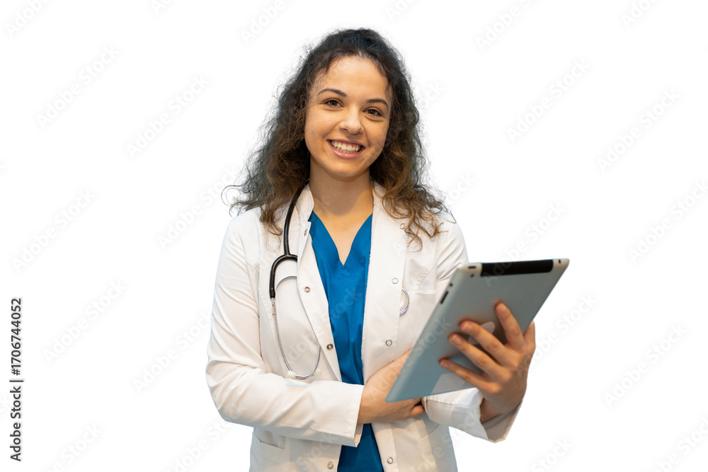 Female doctor smiling while holding a tablet, showcasing expertise in healthcare technology against a transparent background