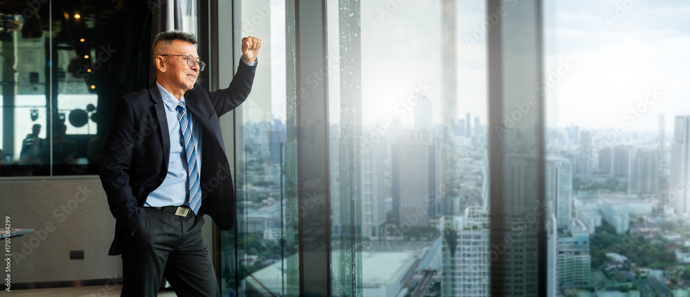 Asian businessman looks out window on modern tower,stressed about the economy,falling stocks,business crisis,uncertain future,financial failure,Bankruptcy.financial losses and Economic crisis concept