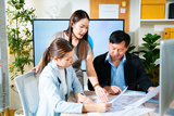 Group of creative Businesspeople brain storm meeting presentation,discussing roadmap to product launch, planning,strategy,dashboard,new business development,working with new startup project in office
