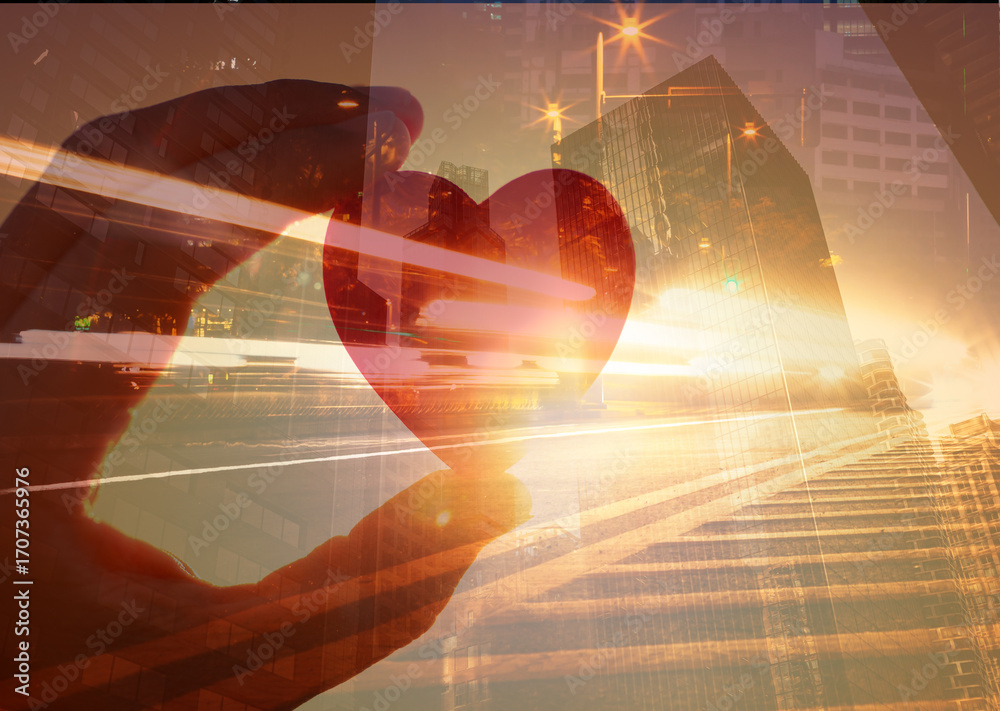 A double exposure scene features hands holding a heart, with city lights and rapid motion streaks, conveying love, connection, and urban romance