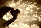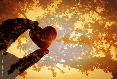 Silhouetted hands holding heart as warm sunset light filters through tree branches, creating a double exposure feel. A romantic, natural moment of love, connection, and peace.