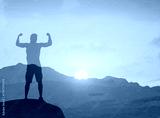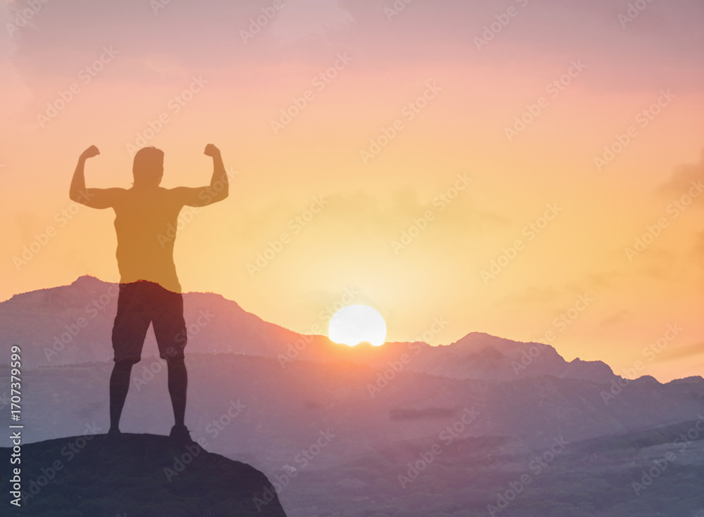 Silhouette of a Heroic Man Standing on a Peak at Sunset with Raised Arms, inspirational scene conveying achievement, motivation, and peak performance