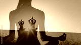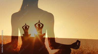 A double-exposure image shows two yoga silhouettes meditating in a field at sunrise. Warm light creates calm inner peace balance, and mindfulness, blending nature with peaceful fitness practice.