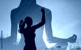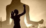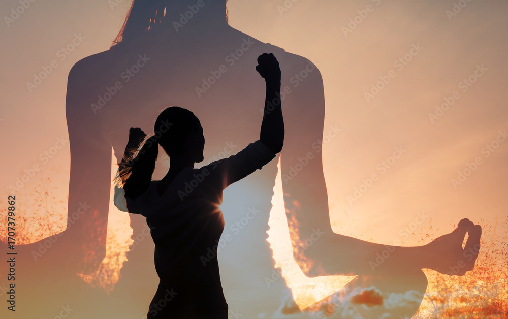 silhouette of a person practicing yoga at sunrise, blending with woman shadow to symbolize inner strength and balance. Perfect for fitness, wellness, motivation, and mindfulness themes