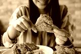 close up focus woman hand hold and showing fried chicken meal for eat at restaurant bar,fast food concept,healthcare living