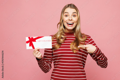 Young happy woman she wear red striped sweatshirt casual clothes hold point on gift certificate coupon voucher card for store isolated on plain pastel light pink background studio. Lifestyle concept.