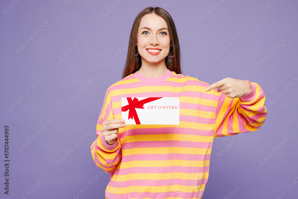 Young woman wears yellow sweatshirt casual clothes hold point index finger on gift certificate coupon voucher card for store isolated on plain pastel light purple background studio. Lifestyle concept.