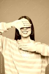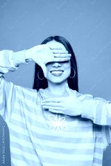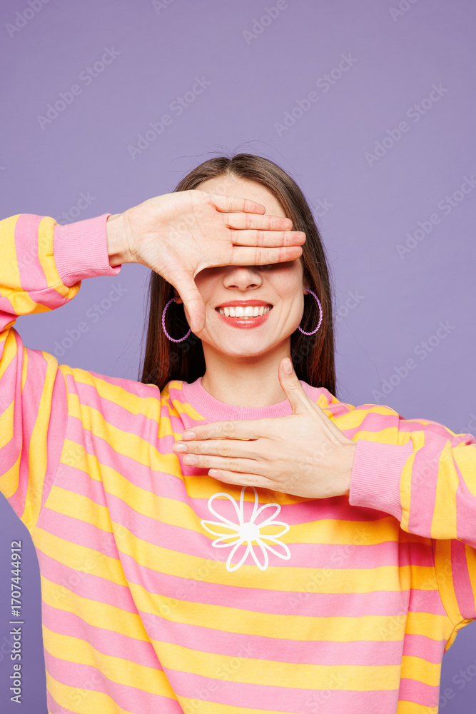 Young woman she wears yellow sweatshirt casual clothes point on opened mouth teeth making hands photo frame gesture isolated on plain pastel light purple background studio portrait. Lifestyle concept.