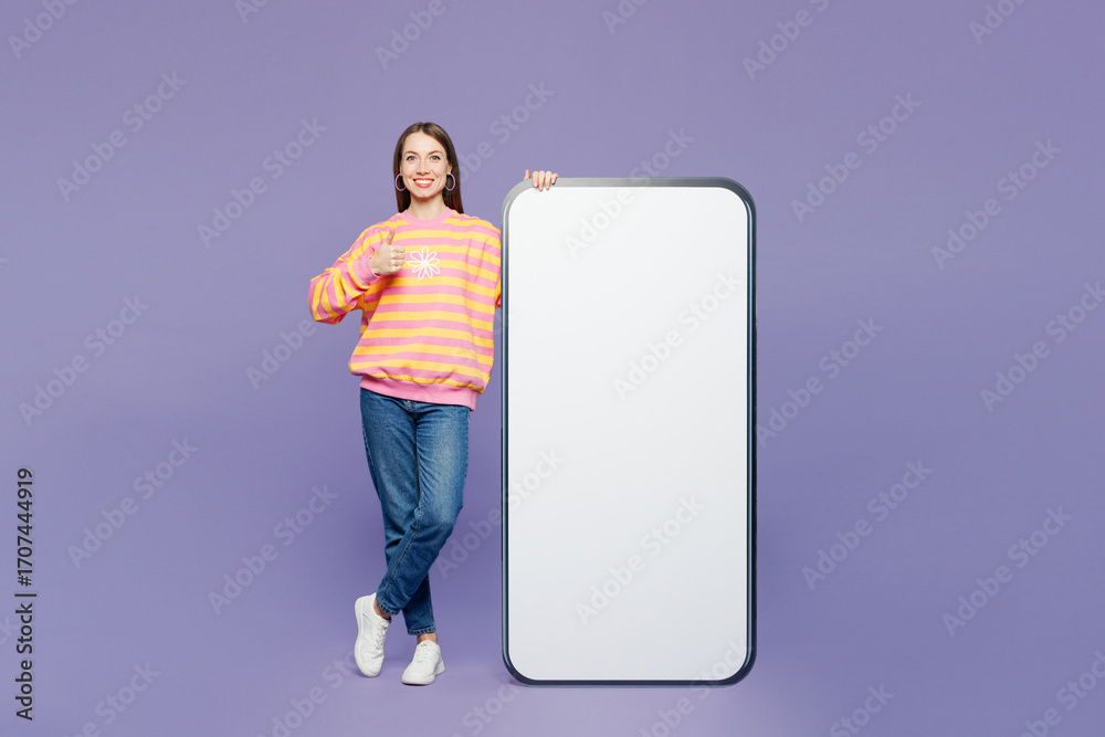 Full body young smiling woman wearing yellow sweatshirt casual clothes big huge blank screen mobile cell phone smartphone with area show thumb up isolated on plain purple background Lifestyle concept