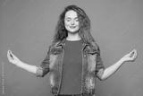 Young ginger woman she wearing red t-shirt denim shirt hold spreading hands in yoga om aum gesture relax meditate try to calm down isolated on plain pastel light purple background. Lifestyle concept.