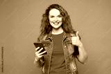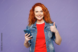 Young smiling happy ginger woman she wears red t-shirt denim shirt hold in hand use mobile cell phone show thumb up isolated on plain pastel light purple background studio portrait. Lifestyle concept.