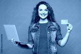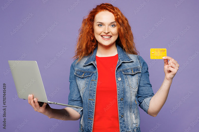 Young ginger woman wear red t-shirt denim shirt using laptop pc computer hold credit bank card doing online shopping order delivery booking tour isolated on plain purple background. Lifestyle concept