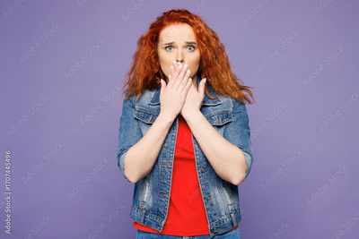 Young sad shocked surprised mad ginger woman she wearing red t-shirt denim shirt cover mouth with hand look camera isolated on plain pastel light purple background studio portrait. Lifestyle concept.