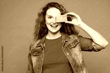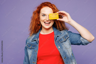 Young happy ginger woman she wears red t-shirt denim shirt hold in hand cover eye with mock up of credit bank card isolated on plain pastel light purple background studio portrait. Lifestyle concept.