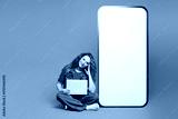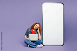 Full body young ginger IT woman wears red t-shirt denim shirt big huge blank screen mobile cell phone with area use work on laptop pc computer isolated on plain purple background. Lifestyle concept.