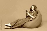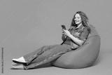 Full body young ginger woman she wears red t-shirt denim shirt sit in bag chair hold in hand use mobile cell phone isolated on plain pastel light purple background studio portrait. Lifestyle concept.