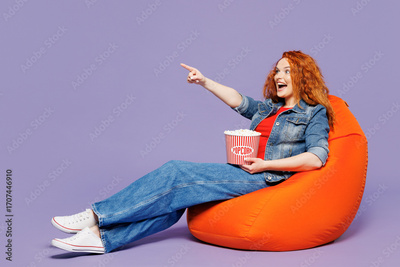 Full body young ginger woman wears red t-shirt denim shirt sit in bag chair point index finger aside eat popcorn watch movie film isolated on plain pastel light purple background. Lifestyle concept.