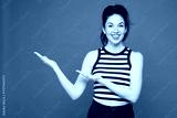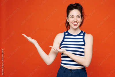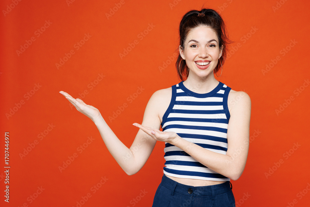 Young smiling happy cool woman she wearing blue striped tank top casual clothes point hands arms aside on area mockup isolated on plain red orange color background studio portrait. Lifestyle concept.