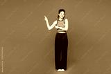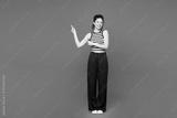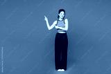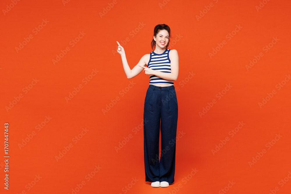 Full body young smiling woman she wears blue striped tank top casual clothes point index finger aside on area mock up isolated on plain red orange color background studio portrait. Lifestyle concept.