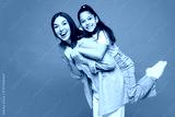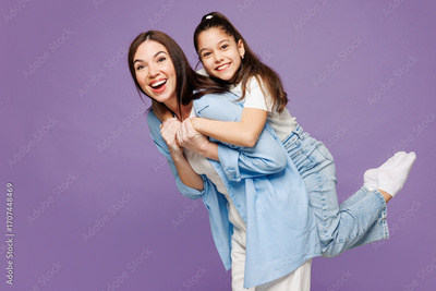 Young happy woman wear blue clothes with child baby girl 8-9 years old. Mommy little kid daughter give piggyback ride to joyful, sit on back isolated on plain purple background. Mother's Day concept.