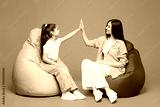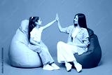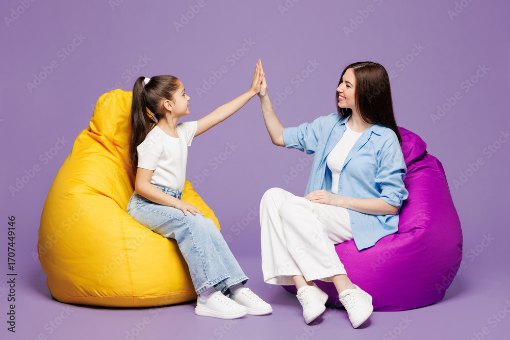 Full body young woman wearing blue casual clothes have fun with child baby girl 8-9 years old. Mommy little kid daughter sitting in bag chair isolated on plain purple background Mother's Day concept
