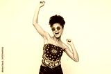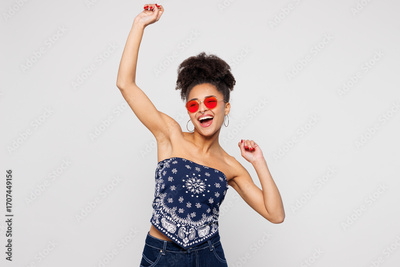 Young woman of African American ethnicity wears blue bandana top casual clothes sunglasses do winner gesture celebrate clenching fists dance isolated on plain solid white background Lifestyle concept