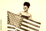 Young woman of African American ethnicity wear blue bandana top casual clothes sunglasses hold American flag look aside isolated on plain white background studio. Lifestyle, the 4th of July concept.