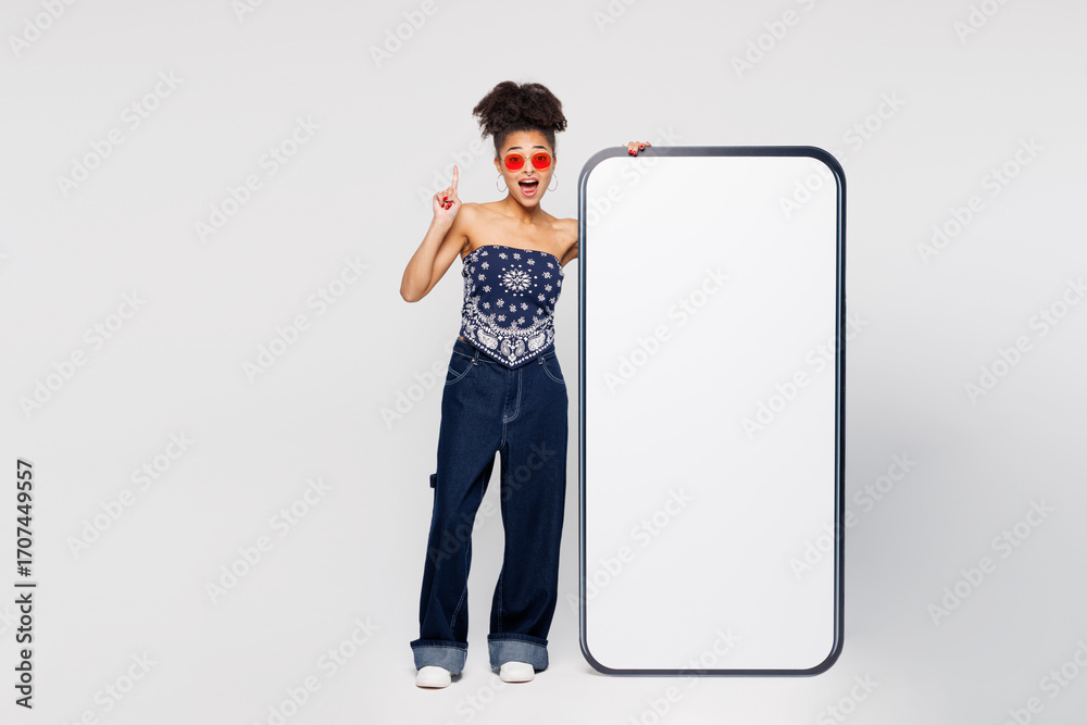 Full body young woman wear blue bandana top casual clothes sunglasses big huge blank screen mobile cell phone smartphone with area point finger up isolated on plain white background Lifestyle concept