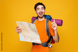 Young traveler man carry backpack with stuff mat read map have idea isolated on plain yellow background. Tourist leads active healthy lifestyle walk on spare time Hiking trek rest travel trip concept