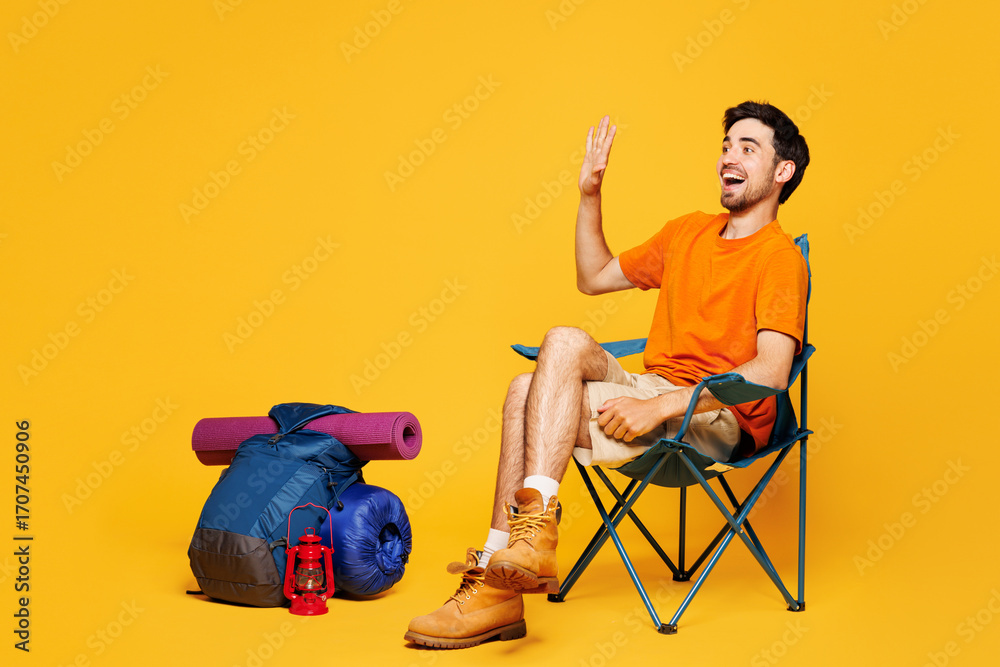 Young traveler man sit in chair near backpack with stuff mat wave hand isolated on plain yellow background. Tourist leads active healthy lifestyle walk on spare time. Hiking trek travel trip concept.
