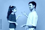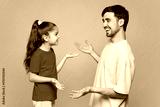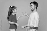 Side view young smiling parent man with child girl wearing red casual clothes. Daddy little kid daughter talk speak with each other isolated on plain pink background. Father's Day Love family concept.