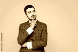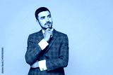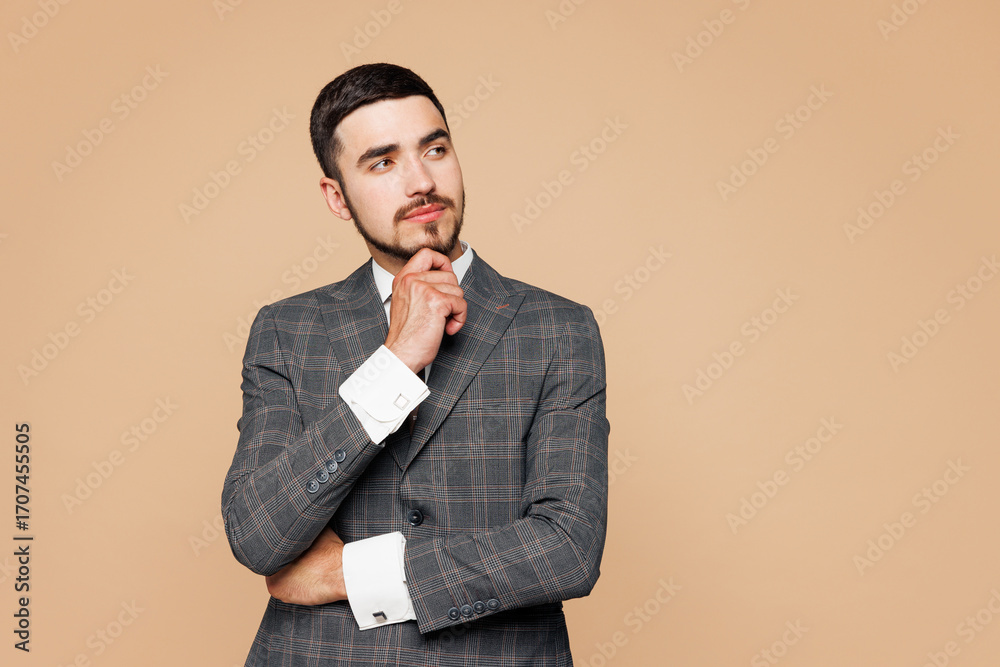 Young minded successful employee business man corporate lawyer wear classic formal grey suit shirt tie work in office look aside prop up chin isolated on plain beige color background studio portrait.