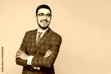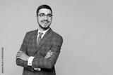 Side view young successful employee business man corporate lawyer wear classic formal grey suit shirt tie glasses work in office look aside on area isolated on plain beige background studio portrait.