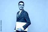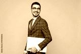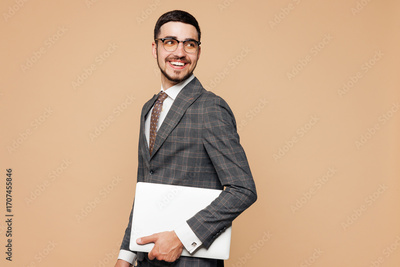 Young employee IT business man corporate lawyer he wear formal grey suit shirt tie glasses work in office hold closed laptop pc computer look aside isolated on plain beige background studio portrait.