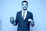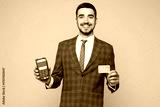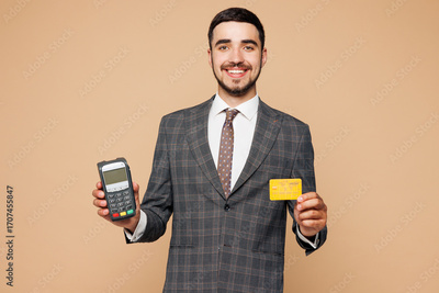 Young happy smiling employee business man corporate lawyer wear formal grey suit shirt tie work in office hold bank payment terminal to process acquire credit card isolated on plain beige background.