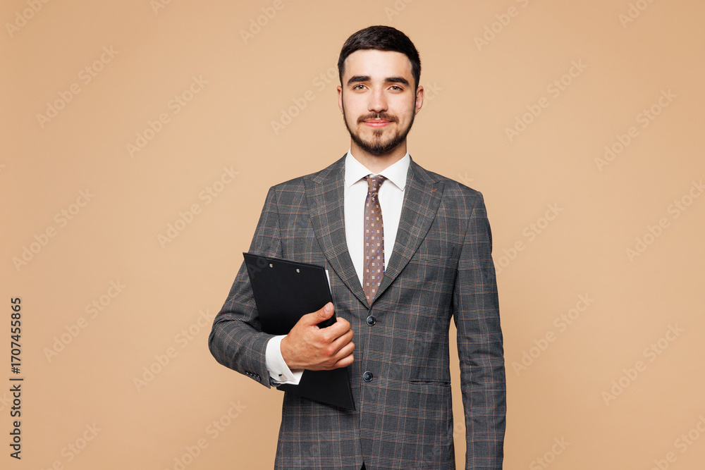 Young successful employee business man corporate lawyer wears classic formal grey suit shirt tie work in office hold clipboard with paper account documents isolated on plain beige background studio.