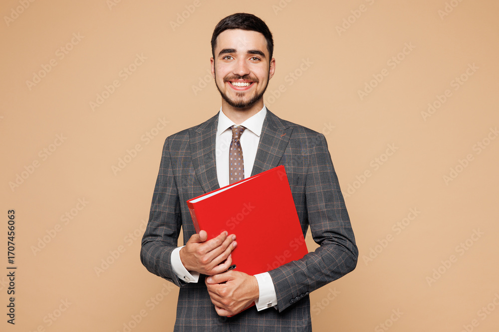 Young employee business man corporate lawyer wear classic formal grey suit shirt tie work in office hold red folder for papers document bookkeeping isolated on plain beige background studio portrait.