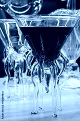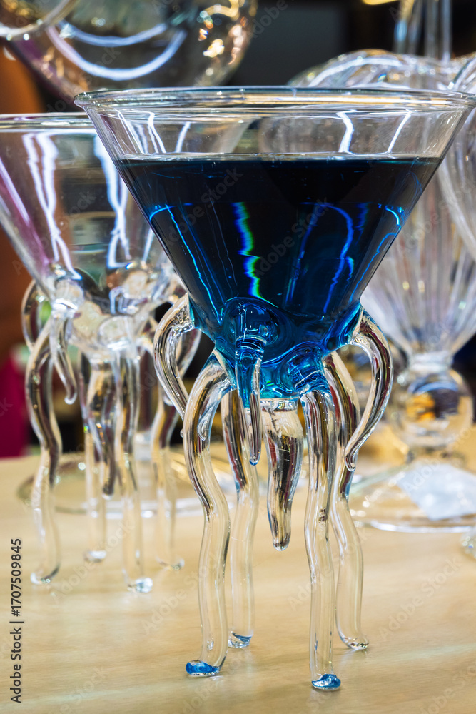 Unique glass cocktail with vibrant blue liquid, featuring an artistic, octopus-like design on its stem. A visually striking, elegant drink for a sophisticated setting or celebration.