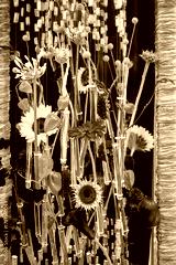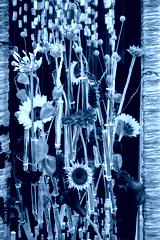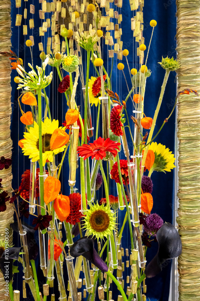 Vibrant, artistic floral arrangement featuring sunflowers, gerberas, calla lilies, and Chinese lanterns in a modern display with individual test tubes, set against a deep blue background. Perfect for