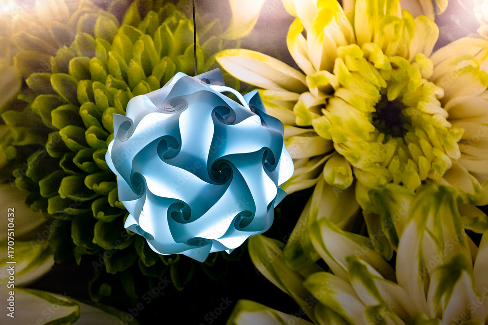 Modern geometric blue lamp illuminates against a vibrant, abstract background of blurred green and yellow floral patterns, creating a stylish and artistic decor.