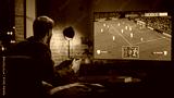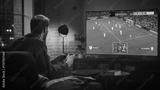 Caucasian Man Spending Time at Home in the Evening, Playing a Soccer Video Game on a Big TV Set at Home. Young Male Sitting on a Sofa, Using a Controller to Defeat a Rival Football Team Online