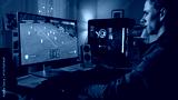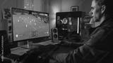 Young Man Playing an Online Football Match on a Desktop Computer, Sitting Behind a Desk. Male Using Mouse and Keyboard, Winning a Video Game Soccer Tournament with a Successful Goal