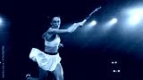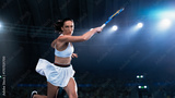 Athletic Female Tennis Player Hitting a Ball Under Spotlights in a Dark Stadium with Spectators. Cinematic Shot Captures a Winning Strong Shot During a Match