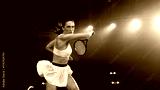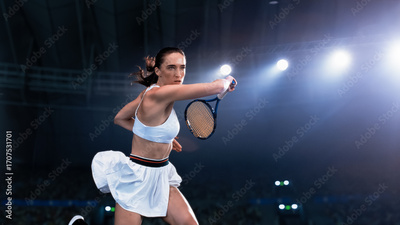 Athletic Female Tennis Player Hitting a Ball Under Spotlights in a Dark Stadium with Spectators. Cinematic Shot Captures a Winning Strong Shot During a Match