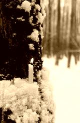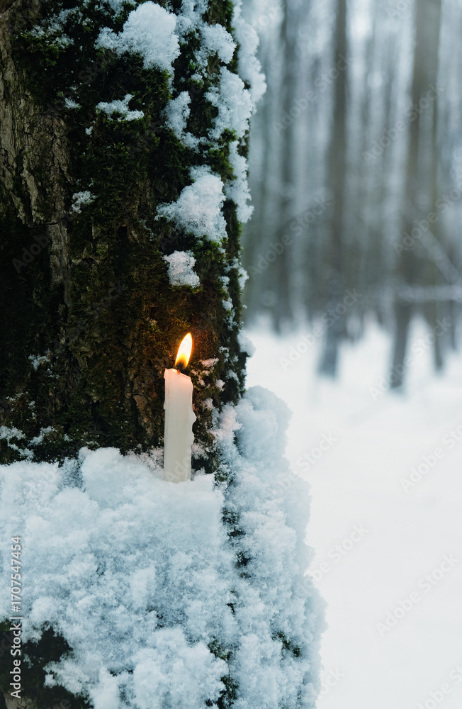 burning white wax candle in snowy tree trunk, nature background of winter woods. mysterious atmosphere. Christmas, New Year, Yule Holidays. witchcraft, magic ritual with candle.