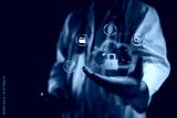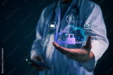 Healthcare, Cloud doctor showcases a secure cloud with lock and data icons in a dark clinic to represent protected patient records, privacy controls, and HIPAA ready medical cloud security concept.