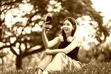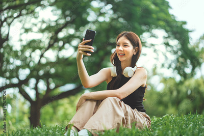 Happy Asian woman sitting in park taking selfie on smartphone, smiling and looking joyful in casual clothes, people and lifestyle concept outdoors