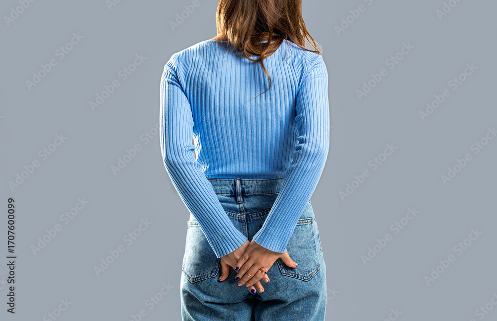 Hemorrhoids. Anus. Pain. Woman holds his hands to the ass feeling pain. Woman hand holding her bottom because having abdominal pain and Hemorrhoids.